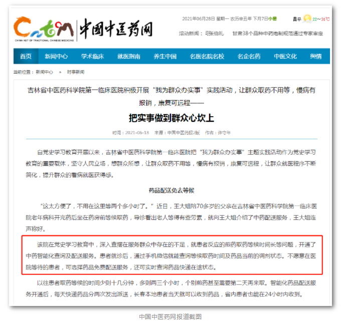 近日,中國(guó)中醫(yī)藥報(bào)2版報(bào)道吉林省中醫(yī)藥科學(xué)院第一臨床醫(yī)院開(kāi)展的“我為群眾辦實(shí)事”實(shí)踐活動(dòng)。其中,吉林省中醫(yī)藥科學(xué)院第一臨床醫(yī)院“藥品配送免去等候”“微信查詢(xún)煎藥狀態(tài)”等服務(wù),便利了就醫(yī)患者,提升了群眾獲得感。
