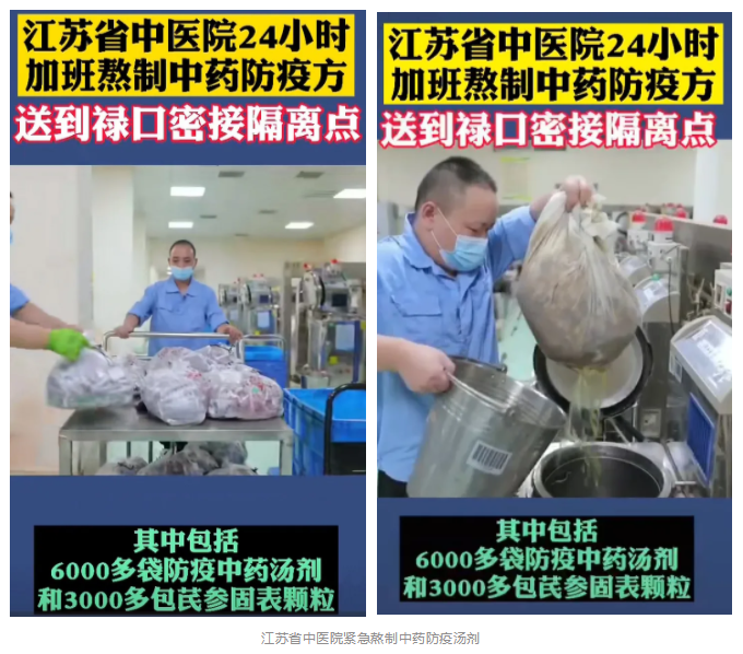 江蘇省中醫(yī)院也在緊鑼密鼓地加班熬制中藥防疫湯劑,24小時不間斷,并送到祿口密接隔離點。