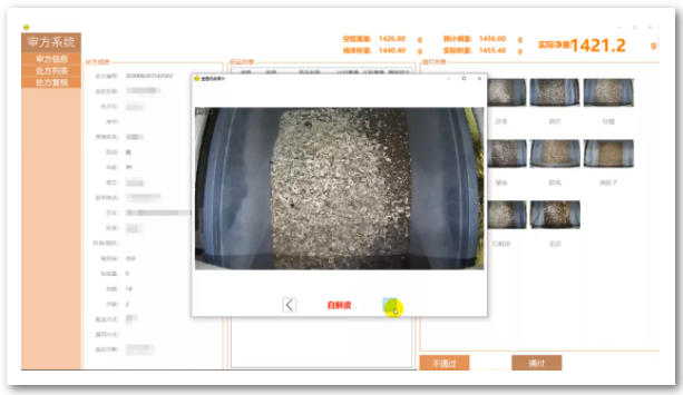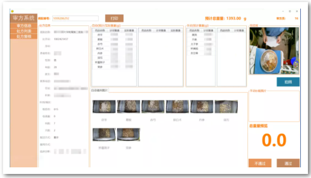 在審方系統(tǒng)中,詳細(xì)列出了處方信息、自動(預(yù)計(jì)/實(shí)際重量)、手動(預(yù)計(jì)重量)、預(yù)計(jì)總重量、自動調(diào)劑圖片、審方照片、審方員編號等,其中自動調(diào)劑圖片清晰可見,便于審方員一一核對。