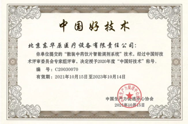 近日,2020年度“中國好技術(shù)”項(xiàng)目庫入選名單公布,北京東華原醫(yī)療設(shè)備有限責(zé)任公司“散裝中藥飲片智能調(diào)劑系統(tǒng)”技術(shù),經(jīng)過中國好技術(shù)評審委員會(huì)專家組評審,榮獲2020年度“中國好技術(shù)”稱號。