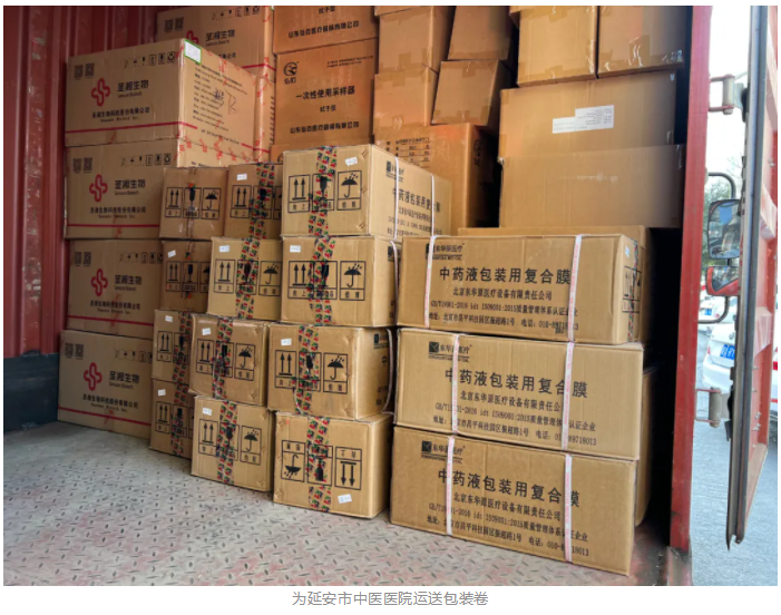 12月28日,正是延安地區(qū)疫情緊張的時期,延安市中醫(yī)醫(yī)院中藥液包裝卷告急?!案咚俜怄i”、“快遞不通”,猶如孤島的情境,讓包裝卷的運送工作陷入僵局。之前由東華原總部發(fā)過去的20套包裝卷也落空了。