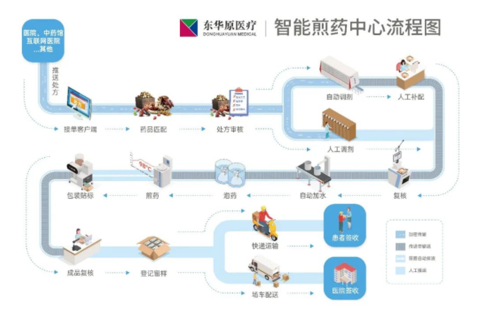 東華原智慧中藥房解決方案是運(yùn)用計(jì)算機(jī)控制、物聯(lián)網(wǎng)及互聯(lián)網(wǎng)技術(shù),以煎藥、包裝設(shè)備為中心,將煎藥工藝的多個(gè)流程、終端客戶服務(wù)、設(shè)備和人員管理、煎藥工藝質(zhì)量控制等環(huán)節(jié)進(jìn)行全過程控制與管理的創(chuàng)新煎藥服務(wù)模式。目前,東華原智慧中藥房(現(xiàn)代化煎藥中心)已在全國落地300余家,成為中醫(yī)藥現(xiàn)代化的中堅(jiān)力量。