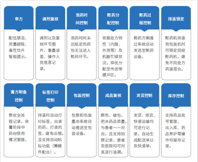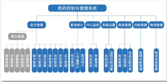 此外,軟件控制系統(tǒng)還包括處方接收和審核管理、膏方制備管理、煎藥大數(shù)據(jù)平臺建設(shè)、患者煎藥信息微信公眾號查詢、中藥物流配送管理等功能。