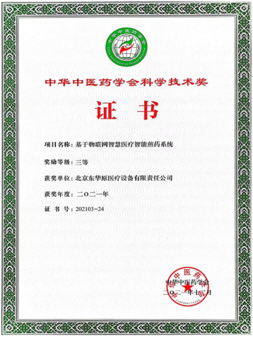 2021年度中華中醫(yī)藥學(xué)會科學(xué)技術(shù)獎、李時珍醫(yī)藥創(chuàng)新獎評審工作結(jié)束,獲獎名單揭曉。北京東華原醫(yī)療設(shè)備有限責(zé)任公司以“基于物聯(lián)網(wǎng)智慧醫(yī)療智能煎藥系統(tǒng)”項目榮獲中華中醫(yī)藥學(xué)會科學(xué)技術(shù)獎,東華原再次以推動中藥現(xiàn)代化發(fā)展的硬實力獲得大力認(rèn)可。