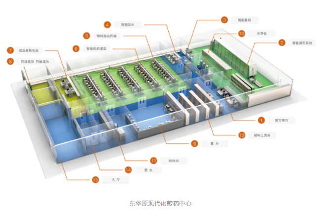 東華原現(xiàn)代化煎藥中心在基礎(chǔ)的中藥煎煮包裝設(shè)備和智能煎藥系統(tǒng)之上,還可配備中藥飲片智能調(diào)劑系統(tǒng)、自動加水系統(tǒng)和自動化運輸系統(tǒng),將人工抓藥、人工泡藥和人工搬運等耗時耗力且精準(zhǔn)度和效率難保障的傳統(tǒng)工序升級為自動化操作,并通過智能煎藥系統(tǒng)管理自動調(diào)劑、加水及運輸?shù)南嚓P(guān)數(shù)據(jù),開展線上復(fù)核和數(shù)據(jù)追溯。