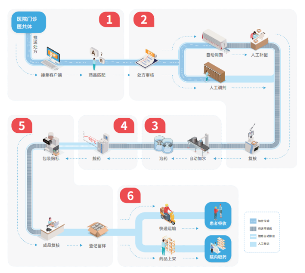智慧共享中藥房,是運用計算機控制、物聯(lián)網(wǎng)及互聯(lián)網(wǎng)技術(shù),以煎藥、包裝設(shè)備為中心,將煎藥工藝流程(包括處方管理、調(diào)劑、浸泡、物料傳輸、煎藥、包裝、物流配送)、終端客戶服務(wù)、設(shè)備和人員管理、煎藥工藝質(zhì)量控制等環(huán)節(jié)進行全過程控制與管理的創(chuàng)新煎藥服務(wù)模式。