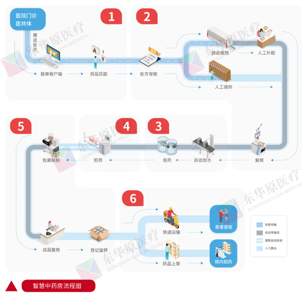 智慧中藥房,是運(yùn)用計(jì)算機(jī)控制、物聯(lián)網(wǎng)及互聯(lián)網(wǎng)技術(shù),以煎藥、包裝設(shè)備為中心,將煎藥工藝流程(包括處方管理、調(diào)劑、浸泡、物料傳輸、煎藥、包裝、物流配送)、終端客戶服務(wù)、設(shè)備和人員管理、煎藥工藝質(zhì)量控制等環(huán)節(jié)進(jìn)行全過程控制與管理的創(chuàng)新煎藥服務(wù)模式。