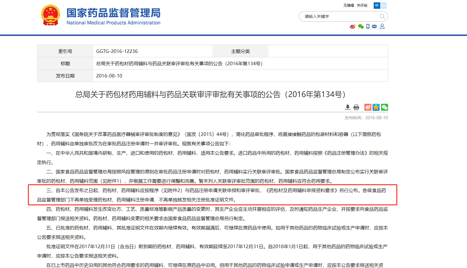 2016年,國家藥品監(jiān)督管理局發(fā)布《總局關(guān)于藥包材藥用輔料與藥品關(guān)聯(lián)審評(píng)審批有關(guān)事項(xiàng)的公告》第三條內(nèi)容規(guī)定,藥包材應(yīng)按程序與藥品注冊(cè)申請(qǐng)關(guān)聯(lián)申報(bào)和審評(píng)審批,各級(jí)食品藥品監(jiān)督管理部門不再單獨(dú)受理藥包材、藥用輔料注冊(cè)申請(qǐng),不再單獨(dú)核發(fā)相關(guān)注冊(cè)批準(zhǔn)證明文件。