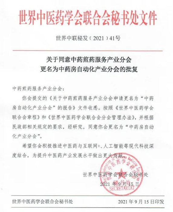 2021年9月15日,經(jīng)世界中醫(yī)藥學(xué)會(huì)聯(lián)合會(huì)批復(fù)同意,中藥煎藥服務(wù)產(chǎn)業(yè)分會(huì)正式更名為“中藥房自動(dòng)化產(chǎn)業(yè)分會(huì)”。自即日起,原分會(huì)名稱“中藥煎藥服務(wù)產(chǎn)業(yè)分會(huì)”不再使用。