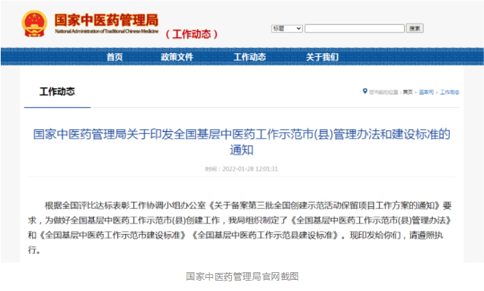 國(guó)家中醫(yī)藥管理局:全國(guó)基層中醫(yī)藥工作示范市(縣)管理辦法和建設(shè)標(biāo)準(zhǔn)印發(fā)