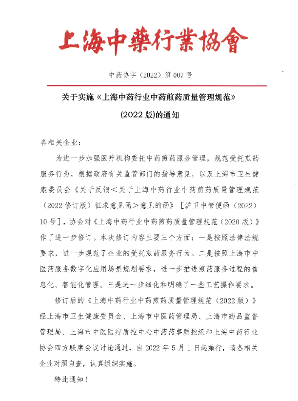 上海中藥行業(yè)中藥煎藥質(zhì)量管理規(guī)范(2022版)