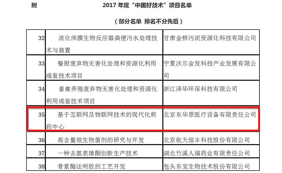 2018年5月11日中國生產(chǎn)力促進中心協(xié)會公布了2017年度“中國好技術(shù)”評審結(jié)果。其中北京東華原醫(yī)療設(shè)備有限責(zé)任公司的《基于互聯(lián)網(wǎng)及物聯(lián)網(wǎng)技術(shù)的現(xiàn)代化煎藥中心》入圍2017年度 “中國好技術(shù)”獎項。