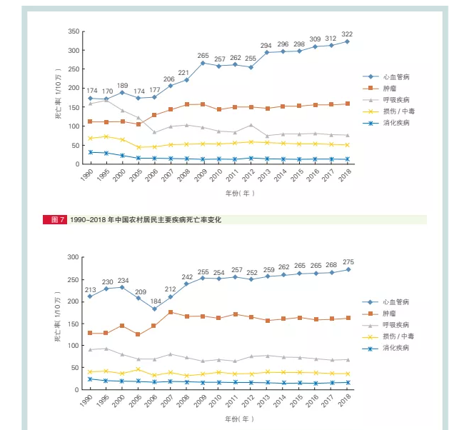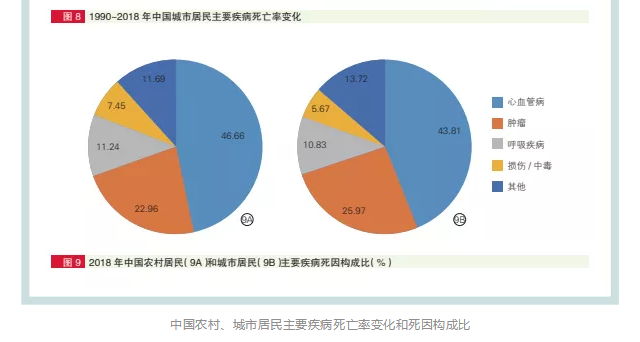 城鄉(xiāng)居民疾病死亡構(gòu)成比中,心血管病占首位。2018年農(nóng)村、城市心血管病分別占死因的46.66%和43.81%。每5例死亡中就有2例死于心血管病。
