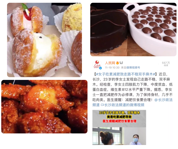 但在這焦慮之下,仿佛有“兩幅面孔”。一方面,減肥不知從什么時(shí)候起,成了各年齡段的“必修課”。前幾日,一則減肥新聞登上熱門。長沙一名23歲女子為了減肥,長期不吃肉類,導(dǎo)致四肢肌力下降,中度貧血、低蛋白癥,在癥狀上表現(xiàn)為走路不穩(wěn),雙手麻木。另一方面,與減肥相對的,網(wǎng)絡(luò)上充斥的各種吃播、美食視頻以及走紅的各種“拉絲”“爆漿”“油炸”的網(wǎng)紅美食、高熱量食品,與久坐不動(dòng)的習(xí)慣交織在一起,不斷催生出愈加圓潤的身體。