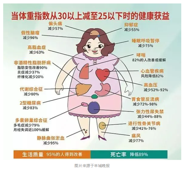 我們在日常的一些健康科普中,經(jīng)常看到肥胖群體存在的健康隱患,卻很少顯而易見地看到減重所直接帶來的健康好處。當(dāng)身體質(zhì)量指數(shù)從30以上減至25以下時(shí),到底會(huì)發(fā)生什么?