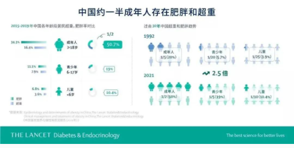 隨著生活水平的不斷提高,肥胖已成為影響人類健康的慢性代謝性疾病。此前,華中科技大學(xué)同濟(jì)醫(yī)學(xué)院公共衛(wèi)生學(xué)院潘安等在《柳葉刀·糖尿病與內(nèi)分泌學(xué)》6月刊上發(fā)表了關(guān)于中國肥胖的系列文章。文章指出,《中國居民營養(yǎng)與慢性病狀況報告(2020年)》最新數(shù)據(jù)顯示,我國超過1/2的成年人超重或肥胖,超重和肥胖率分別為34.3%和16.4%。6歲以下兒童中,1/10超重或肥胖,超重和肥胖率分別為6.8%和3.6%;6—17歲青少年中,近1/5超重或肥胖,超重和肥胖率分別為11.1%和7.9%。