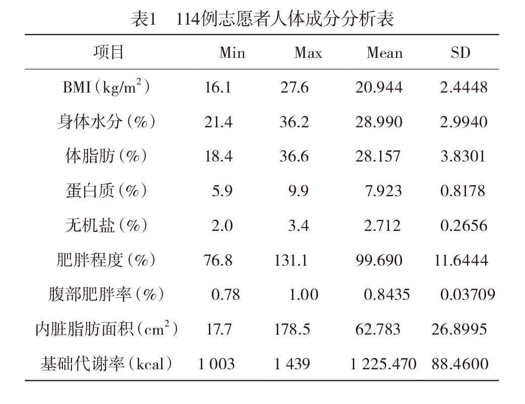 2. 人體成分基本特征 見(jiàn)表1。人體成分分析儀共記錄了114例女性志愿者的BMI、體脂肪、身體水分、蛋白質(zhì),無(wú)機(jī)鹽,肥胖度、腹部肥胖率、內(nèi)臟脂肪面積、基礎(chǔ)代謝率9個(gè)指標(biāo)。