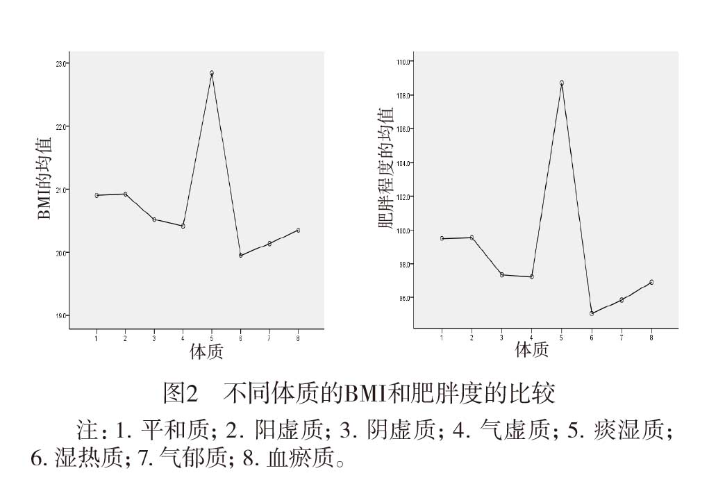 3.2.2 肥胖程度:見(jiàn)圖2。將8種不同體質(zhì)組的肥胖程度進(jìn)行比較,通過(guò)方差分析F=2.482,肥胖度的不同體質(zhì)的分布有統(tǒng)計(jì)學(xué)差異(P<0.05),且痰濕質(zhì)的肥胖程度與其他體質(zhì)相比最高。