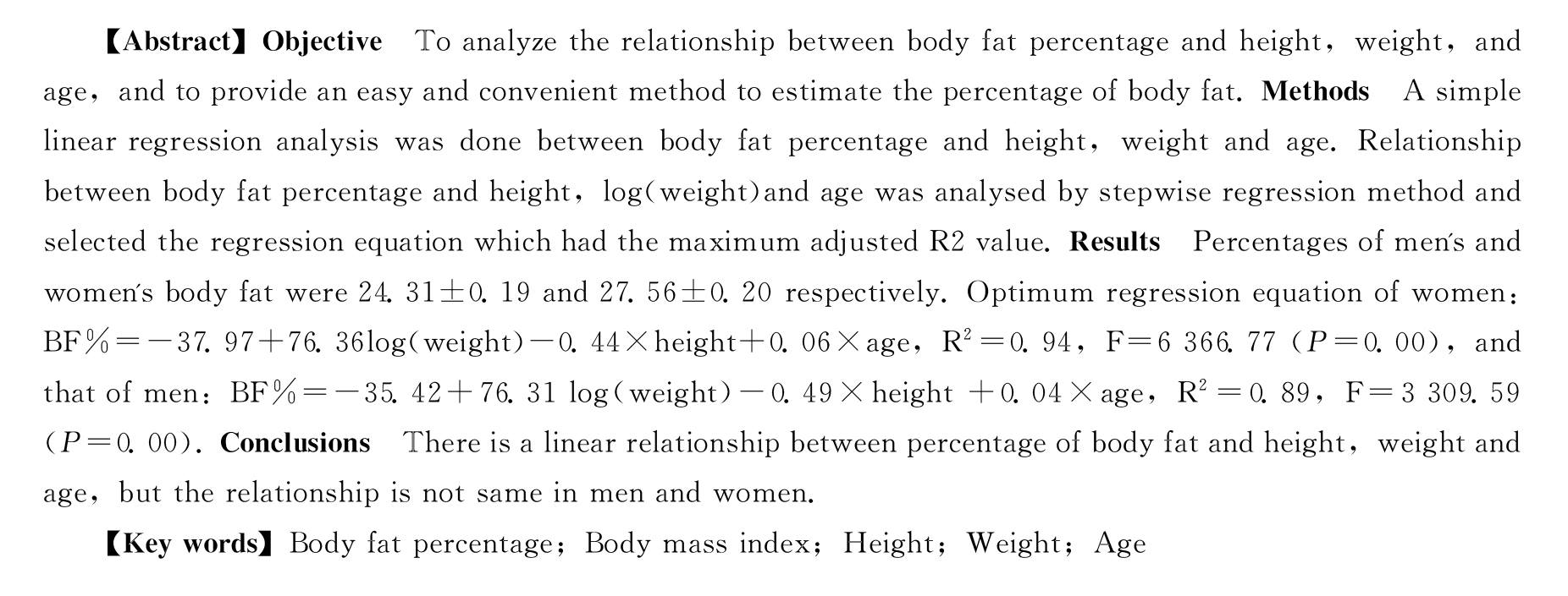 【關(guān)鍵詞】體脂肪率;人體質(zhì)量指數(shù);身高;體質(zhì)量;年齡