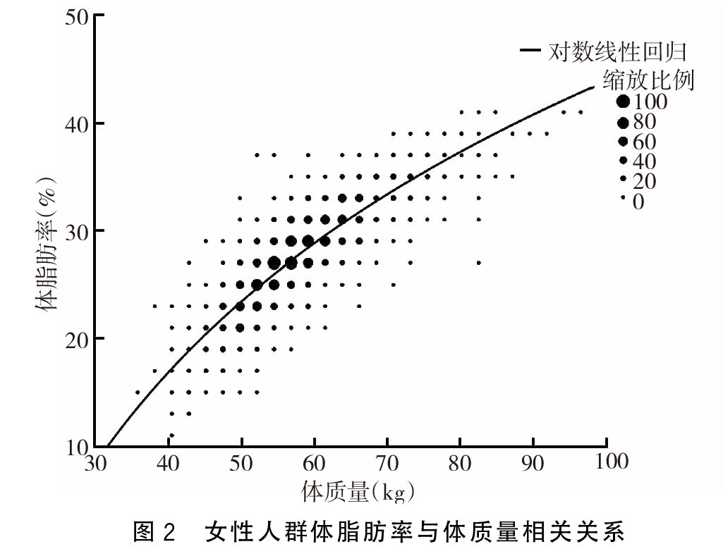 采用SPSS?。保福败浖?,繪制體脂肪率-體質(zhì)量散點(diǎn)圖。對(duì)體脂肪率與身高、體質(zhì)量以及年齡之間做簡單線性回歸分析。運(yùn)用逐步回歸的方法對(duì)體脂肪率和年齡、身高以及取對(duì)數(shù)后的體質(zhì)量之間做多重線性回歸分析,以最大調(diào)整R2值為準(zhǔn)則選擇最優(yōu)回歸方程。