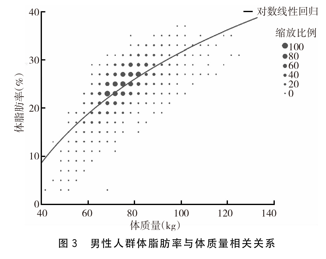 本次調(diào)查結(jié)果顯示,體脂肪率與身高、體質(zhì)量以及年齡之間存在線性關(guān)系。并且,不同性別其線性關(guān)系也不盡相同。體脂肪率與身高、體質(zhì)量以及年齡之間的關(guān)系:與BMI相同,體脂肪率與身高存在著負(fù)相關(guān)的關(guān)系,而與體質(zhì)量存在著正相關(guān)的關(guān)系。但是,與BMI不同的是體脂肪率與體質(zhì)量之間的關(guān)系為對(duì)數(shù)線性關(guān)系。研究顯示,體脂肪率與年齡之間也存在著正相關(guān)關(guān)系,即在同等的條件下,年齡越大則體脂肪率可能越大,但是與身高體質(zhì)量相比,其影響相對(duì)比較小。