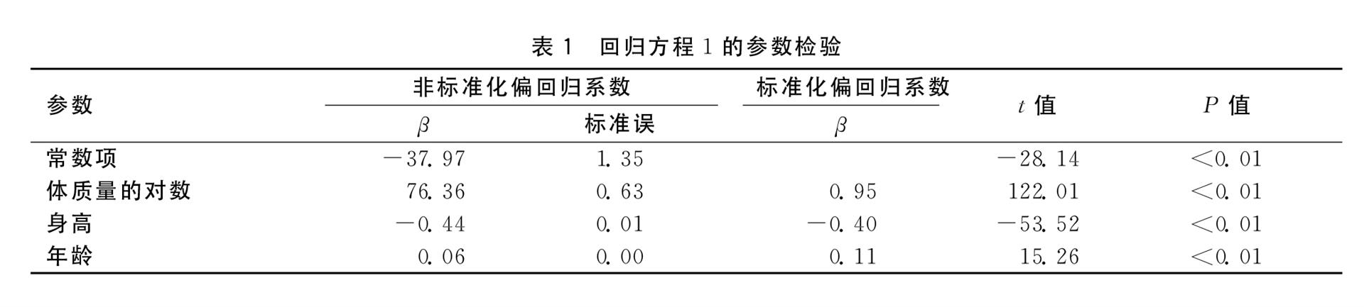 最優(yōu)回歸方程1:體脂肪率=-37.97+76.36log(體質(zhì)量)-0.44×身高+0.06×年齡,R2為0.94,F=6?。常叮叮罚罚ǎ校迹埃埃保驭粒剑埃埃禐闄z驗(yàn)水準(zhǔn),回歸方程及其參數(shù)均有統(tǒng)計(jì)學(xué)意義。見表1。