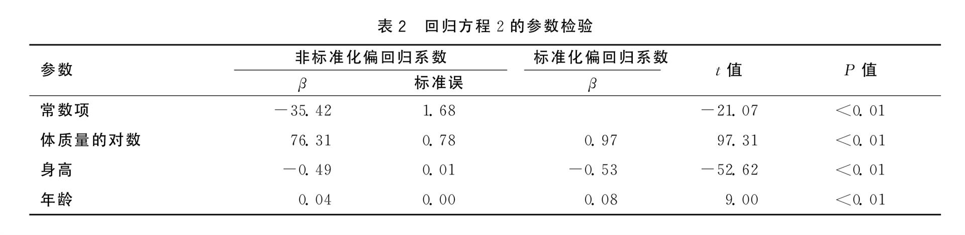 3。多重回歸分析獲得男性人群回歸方程:體脂肪率=-35.42+76.31log(體質(zhì)量)-0.49×身高+0.04×年齡,其中R2=0.89,F=3309.59(P =0.00),以α=0.05為檢驗(yàn)水準(zhǔn),回歸方程及其參數(shù)均有統(tǒng)計(jì)學(xué)意義。見表2。