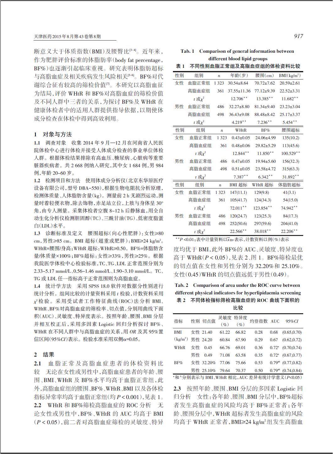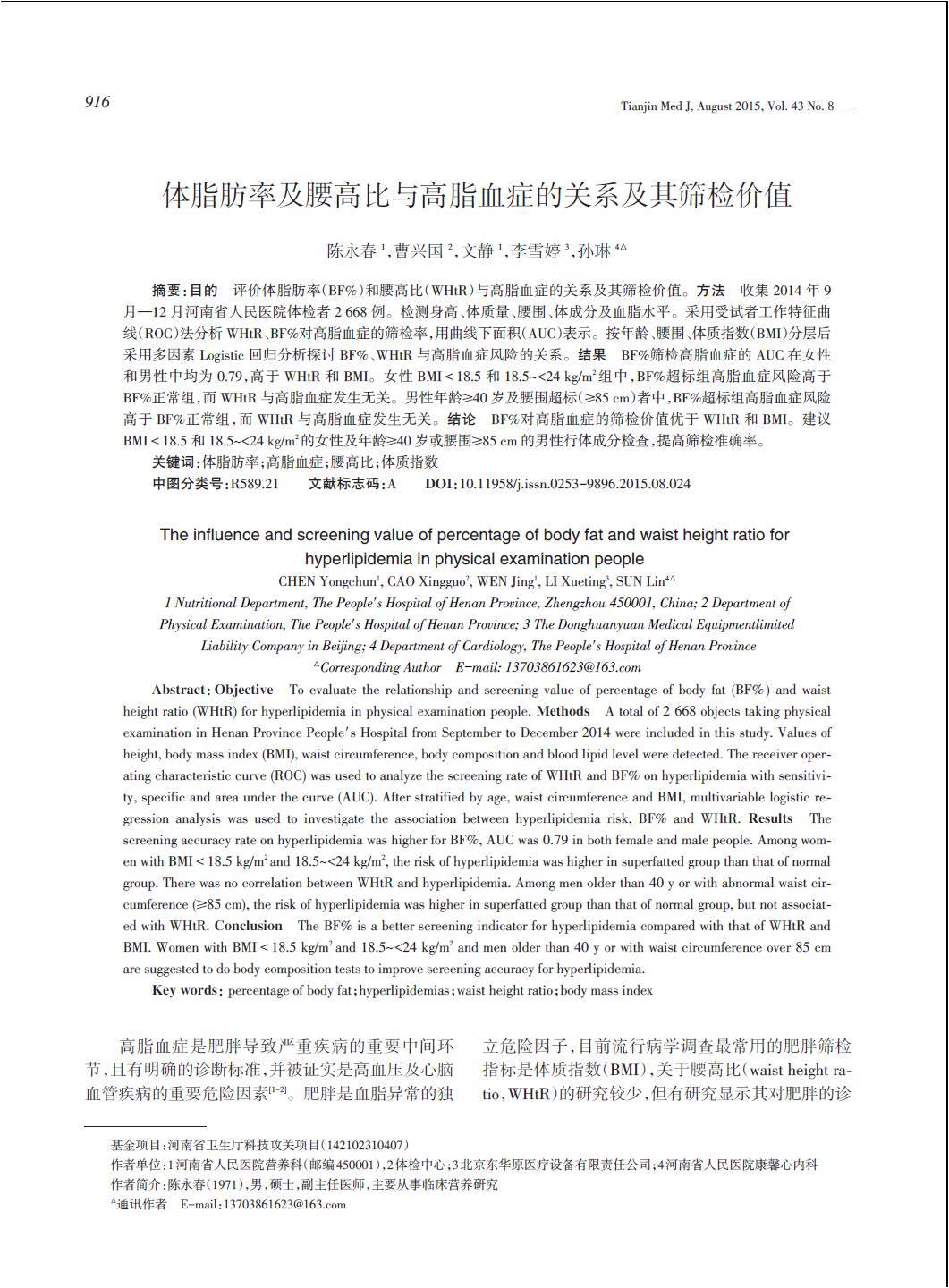 體脂肪率及腰高比與高脂血癥的關系及其篩檢價值