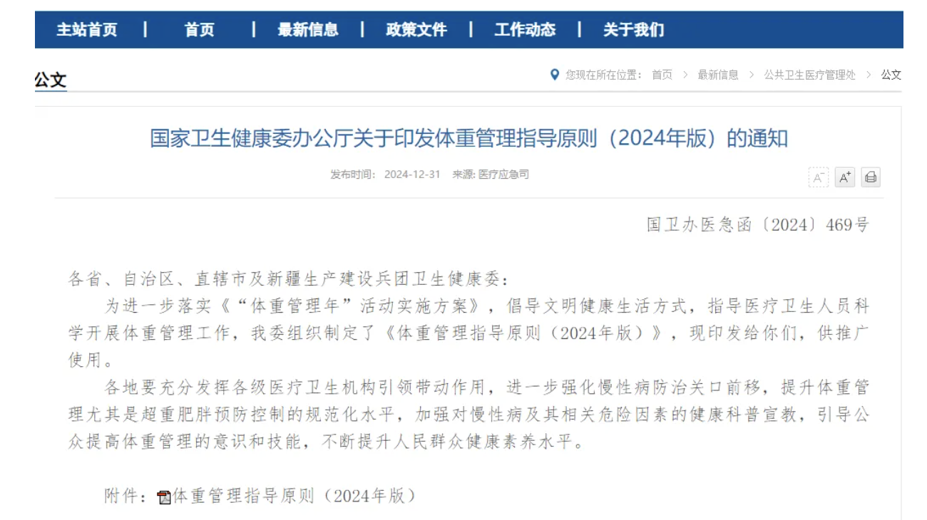 - 近日,卫健委发布《体重管理指导原则(2024年版)》(以下简称《原则》),旨在进一步落实《“体重管理年”活动实施方案》,强化慢性病防治关口前移,倡导文明健康生活方式,加强对慢性病及其相关危险因素的健康科普宣教,指导医疗卫生人员科学开展体重管理工作。