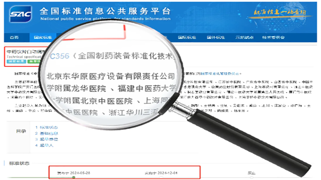 - 5月28日,东华原参与起草的国家标准《中药饮片自动调剂系统技术规范》 列入国家标准规范 ,主管部门为国家标准化管理委员会。将于12月1日开始实施。国家市场监督管理总局对外保留国家标准化管理委员会牌子。以国家标准化管理委员会名义,下达国家标准计划,批准发布国家标准,审议并发布标准化政策、管理制度、规划、公告等重要文件;开展强制性国家标准对外通报;协调、指导和监督行业、地方、团体、企业标准工作;代表国家参加