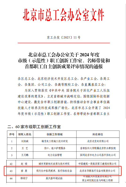 - 近日,北京市总工会发布《关于认定2024年度市级(示范性)职工创新工作室、名师带徒和首都职工自主创新成果的决定》,北京东华原医疗设备有限责任公司的南原创新工作室荣获北京市职工创新工作室荣誉称号,成为本次入选的北京市60家职工创新工作室之一。