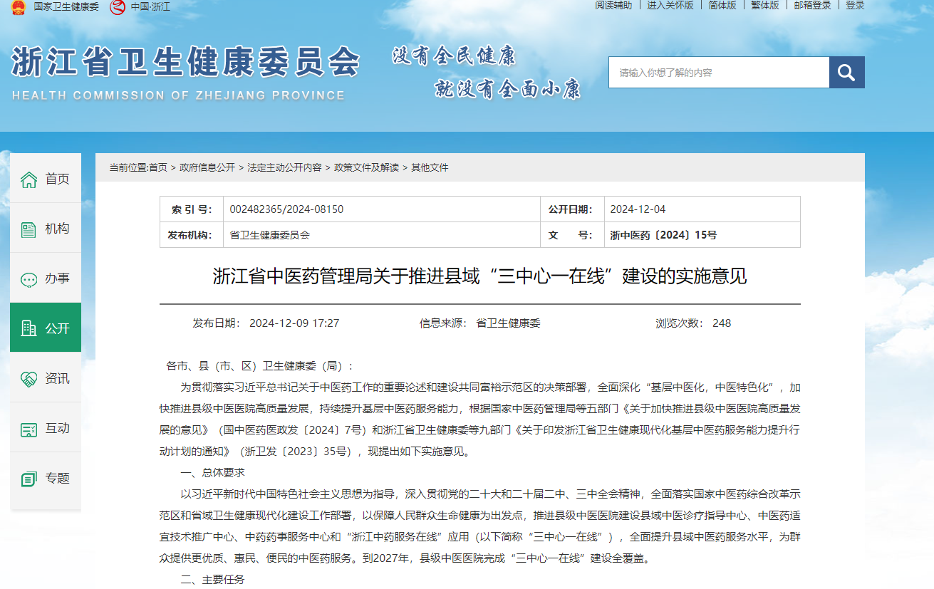 - 近日,浙江省中医药管理局印发《关于推进县域“三中心一在线”建设的实施意见》,在全国首次提出推进县级中医医院建设县域中医诊疗指导中心、中医药适宜技术推广中心、中药药事服务中心和“浙江中药服务在线”应用(以下简称“三中心一在线”),全面提升县域中医药服务水平。到2027年,县级中医医院完成“三中心一在线”建设全覆盖。