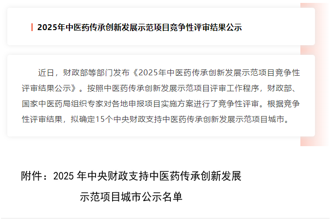 - 近日,财政部等部门发布《2025年中医药传承创新发展示范项目竞争性评审结果公示》。按照中医药传承创新发展示范项目评审工作程序,财政部、国家中医药局组织专家对各地申报项目实施方案进行了竞争性评审。根据竞争性评审结果,拟确定15个中央财政支持中医药传承创新发展示范项目城市。