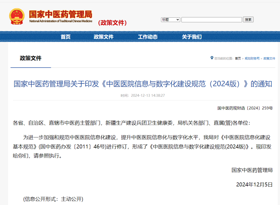 - 日前,为加强和规范中医医院信息与数字化建设,提升中医医院智慧化水平,保障医疗质量和安全,提高管理水平和服务效率,促进中医药与新一代信息技术快速融合发展,国家中医药管理局根据国家相关法律法规、标准规范和行业管理规定,结合中医医院实际,制定并下发《中医医院信息与数字化建设规范(2024版) (以下简称《规范》)。从机构人员、规划与管理、基础设施、信息平台与业务应用、标准与测评、安全防护、数据管理与应用和运行维护等方面提出要求。